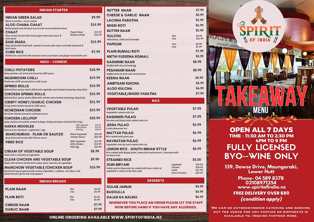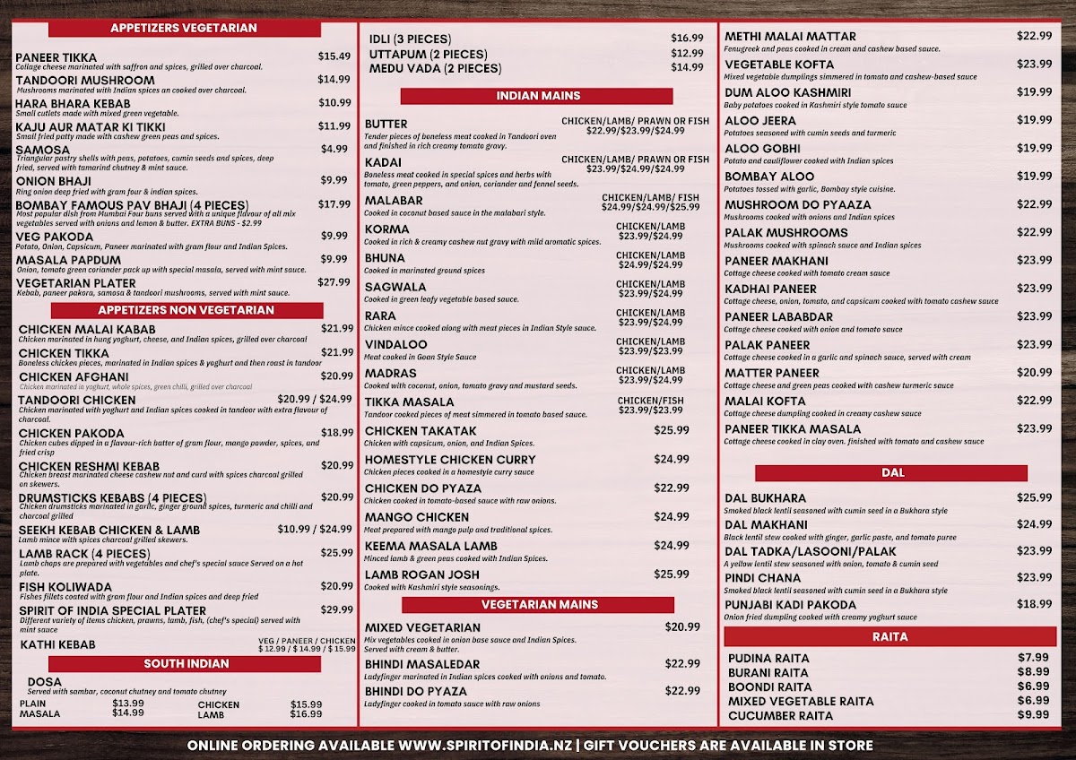 With an extensive menu ranging from starters to mains, Spirit of India is a perfect destination for those craving authentic Indian cuisine with a variety of flavors to suit every palate.